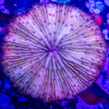 Plate Corals emcompass for more than just fungia, including Cyclopensis, Herpetolita, Heliofungia, Diaseris. We find the best color display to be in slightly lower lights, even partially shaded sometimes and they’re very easy to bleach. Ideally placement is similar to a mushroom coral, but with a bit more flow. They really enjoy the bottom of a bare bottom tank but many species can be easily irritated by stray sand particals on a sand bed. If your find you’re struggling with keeping them long term on your sand bed, and its not a matter of flesh wound from blowing sand, one thing to check is to make sure your sand bed is well siphoned and not trapping nutrients, we move ours bi weekly to siphon underneath them to prevent any build up from irritating them.