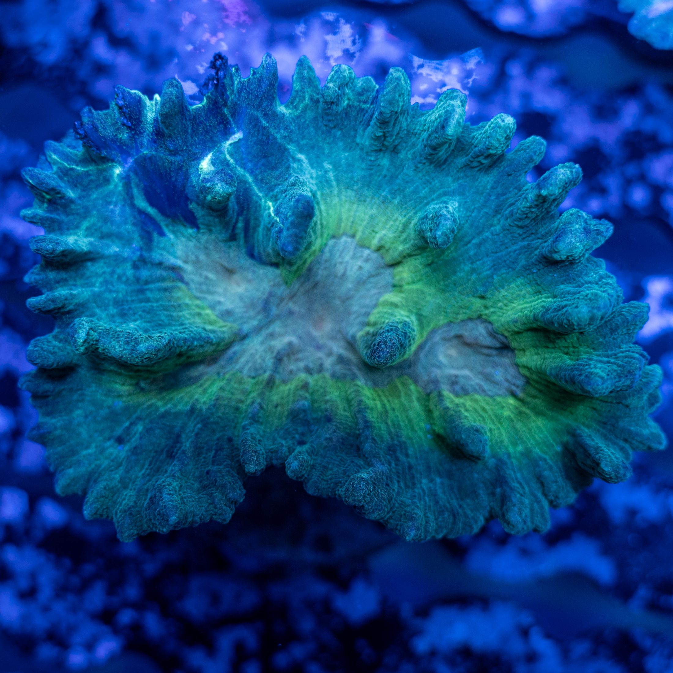 One of the Most Iconic Pectinia is of course “Space Invader.” I’ve been growing this one for nearly a decade this time around and the original piece came from an aquaculture piece with lineage dating back a long time. It is absolutely Neon Green with bright Yellow Eyes.  No doubt an obvious favorite, but I’ve also really come to love the unique rainbow and tricolor varieties that we’ve been importing over the last couple years.