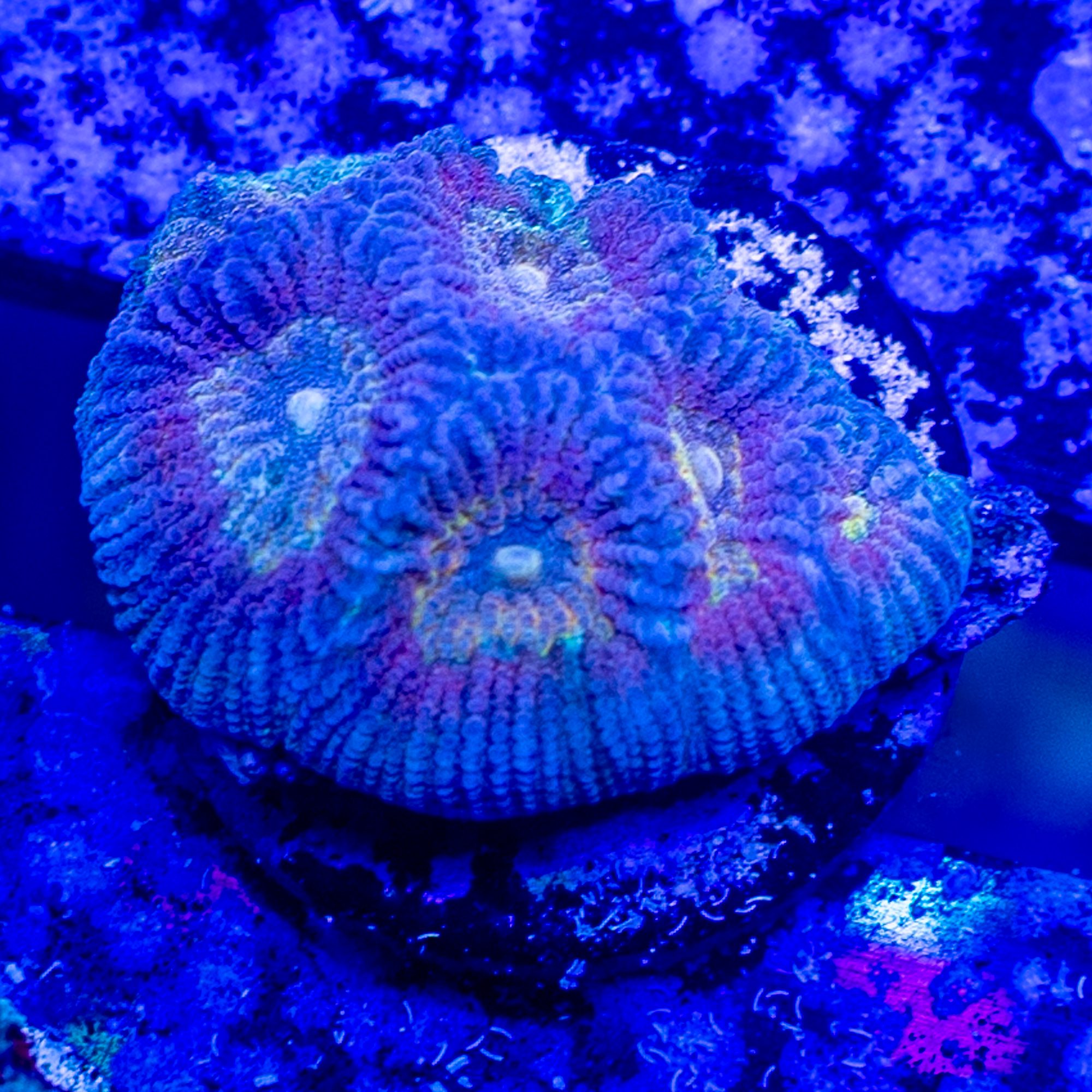 This beautiful rainbow Favia has Yellow Eyes, and nice blue-teal ridging, haloed in pink-purple rings around the eyes.