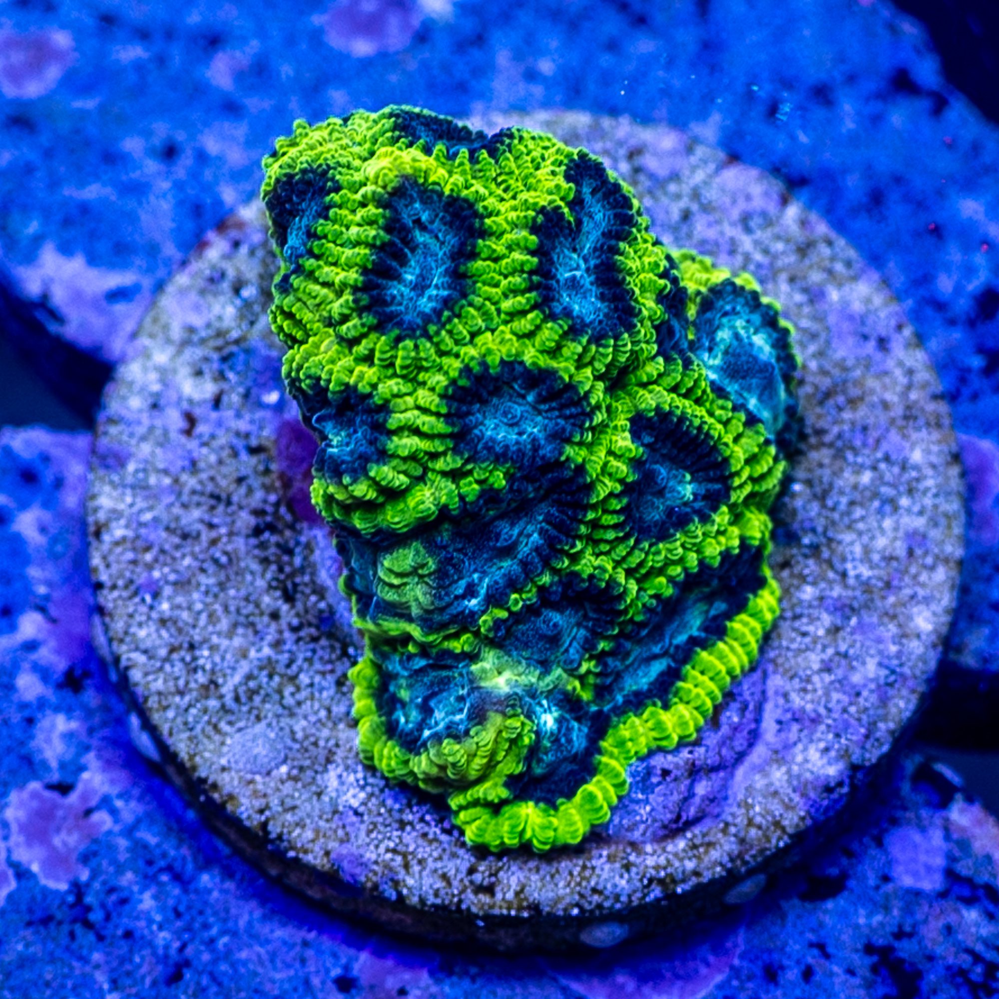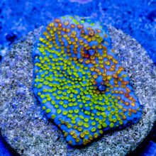 Encrusting Corals aren’t terribly difficult to keep, but beginners often find them to be very slow growing. They have a substantial skeletal structure so they require an ample and balanced availability of dKH and Calcium to grow. Most tend to fluoresce brighter colors in higher light. They can be pretty versatile when it comes to flow, but very few corals can be used to fill a “hot spot” from a strong power head and thrive as well as Favia or Favites!