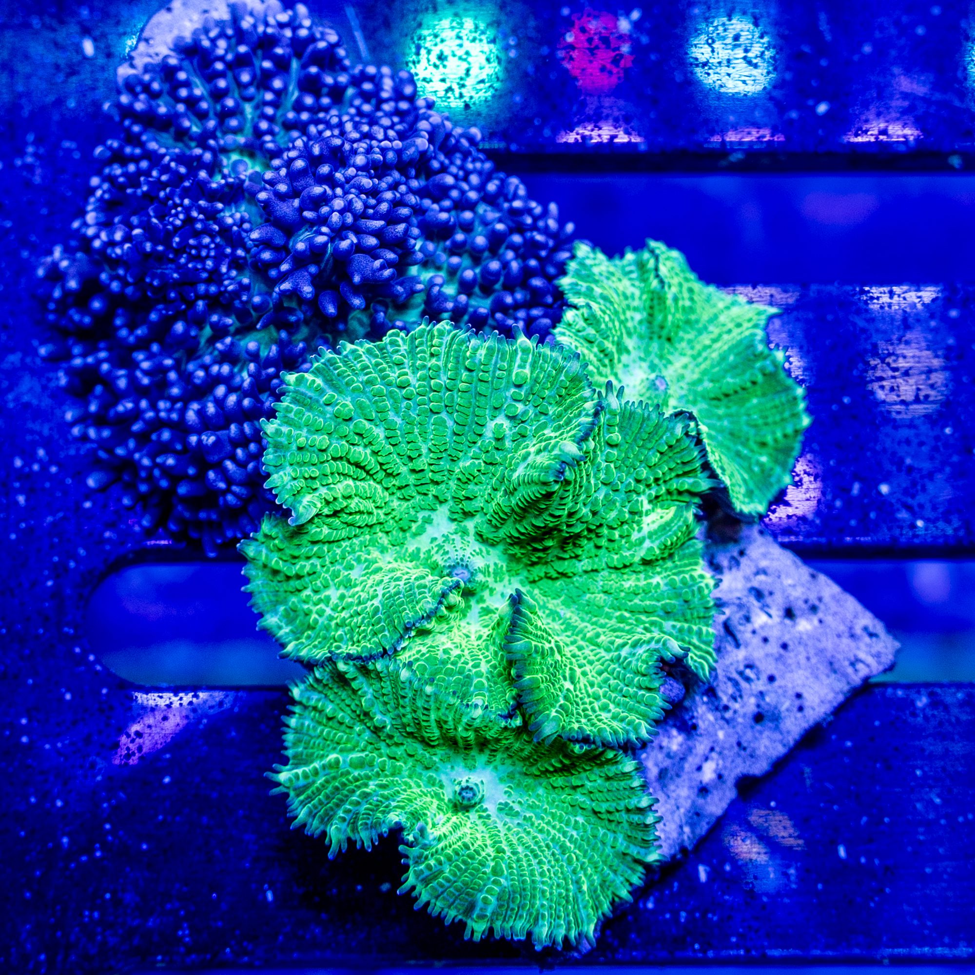 Rhodactis Mushrooms are beautiful intricately patterned mushroom corals that are a great option for beginners, but loved by seasoned hobbyists just the same. They thrive in low to moderate, indirect flow & are adaptable to a wide range of PARs with acclimation.