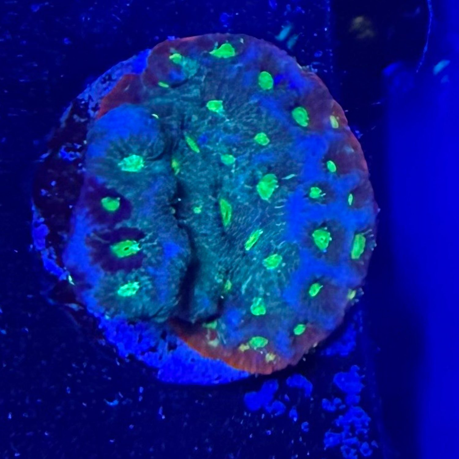 All Blue War Coral with a burning red rim of new growth.