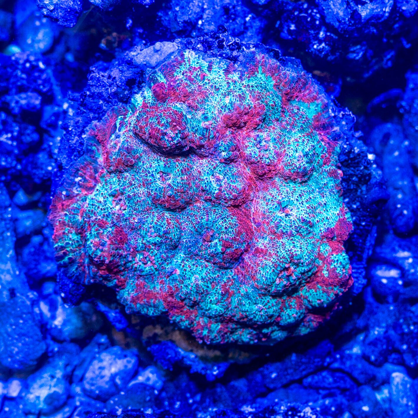 1.5″ Frag of this Ultra Grade Chalice, Crazy Red and Cyan with all kinds of rainbow tones, this has been cookin’ in our tanks at about 150 PAR and low to moderate flow for over a year now!
