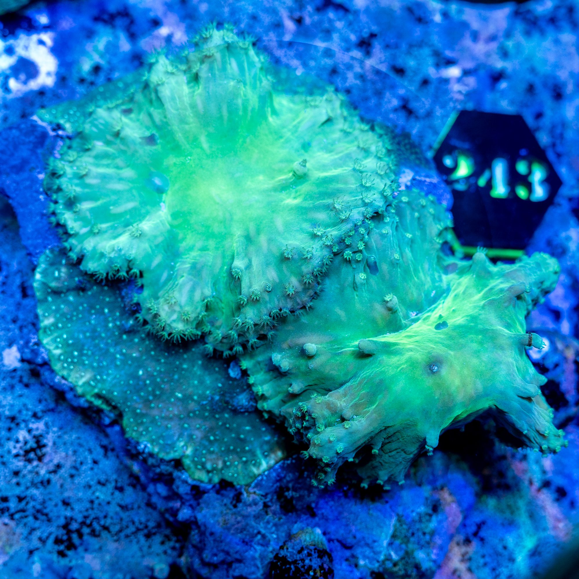 WYSIWYG, neon green Cabbage leather colony with a neat encrusting coral well established along the base.