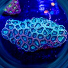 Encrusting Corals aren’t terribly difficult to keep, but beginners often find them to be very slow growing. They have a substantial skeletal structure so they require an ample and balanced availability of dKH and Calcium to grow. Most tend to fluoresce brighter colors in higher light. They can be pretty versatile when it comes to flow, but very few corals can be used to fill a “hot spot” from a strong power head and thrive as well as Favia or Favites!