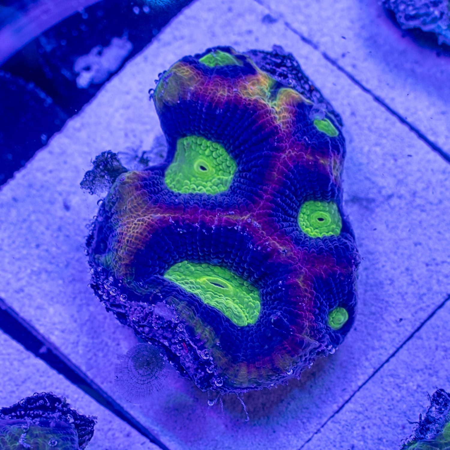 Encrusting Corals aren’t terribly difficult to keep, but beginners often find them to be very slow growing. They have a substantial skeletal structure so they require an ample and balanced availability of dKH and Calcium to grow. Most tend to fluoresce brighter colors in higher light. They can be pretty versatile when it comes to flow, but very few corals can be used to fill a “hot spot” from a strong power head and thrive as well as Favia or Favites!