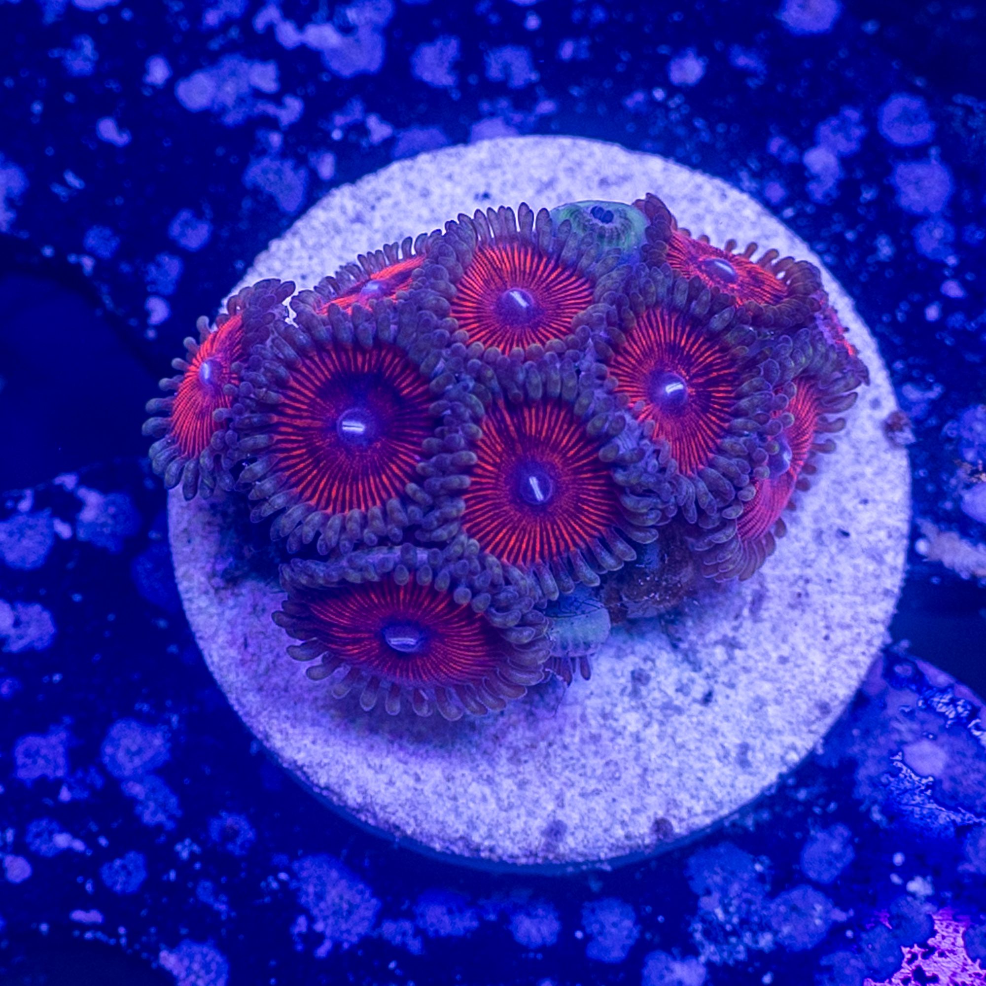 Cultured Palythoas with super bright red metallic face and a blue/purple center.