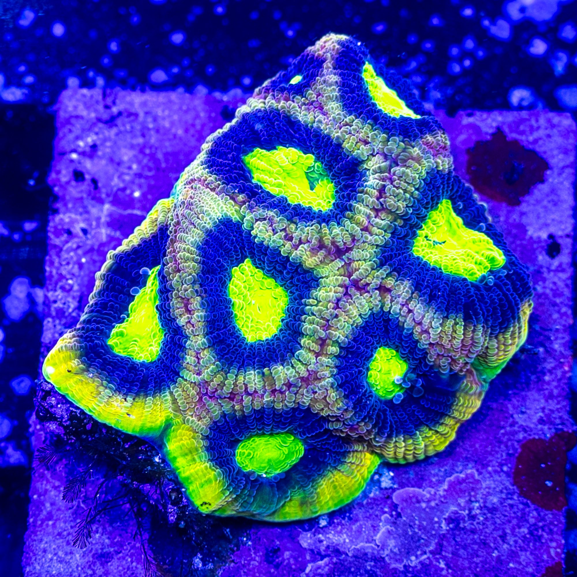 Encrusting Corals aren’t terribly difficult to keep, but beginners often find them to be very slow growing. They have a substantial skeletal structure so they require an ample and balanced availability of dKH and Calcium to grow. Most tend to fluoresce brighter colors in higher light. They can be pretty versatile when it comes to flow, but very few corals can be used to fill a “hot spot” from a strong power head and thrive as well as Favia or Favites!