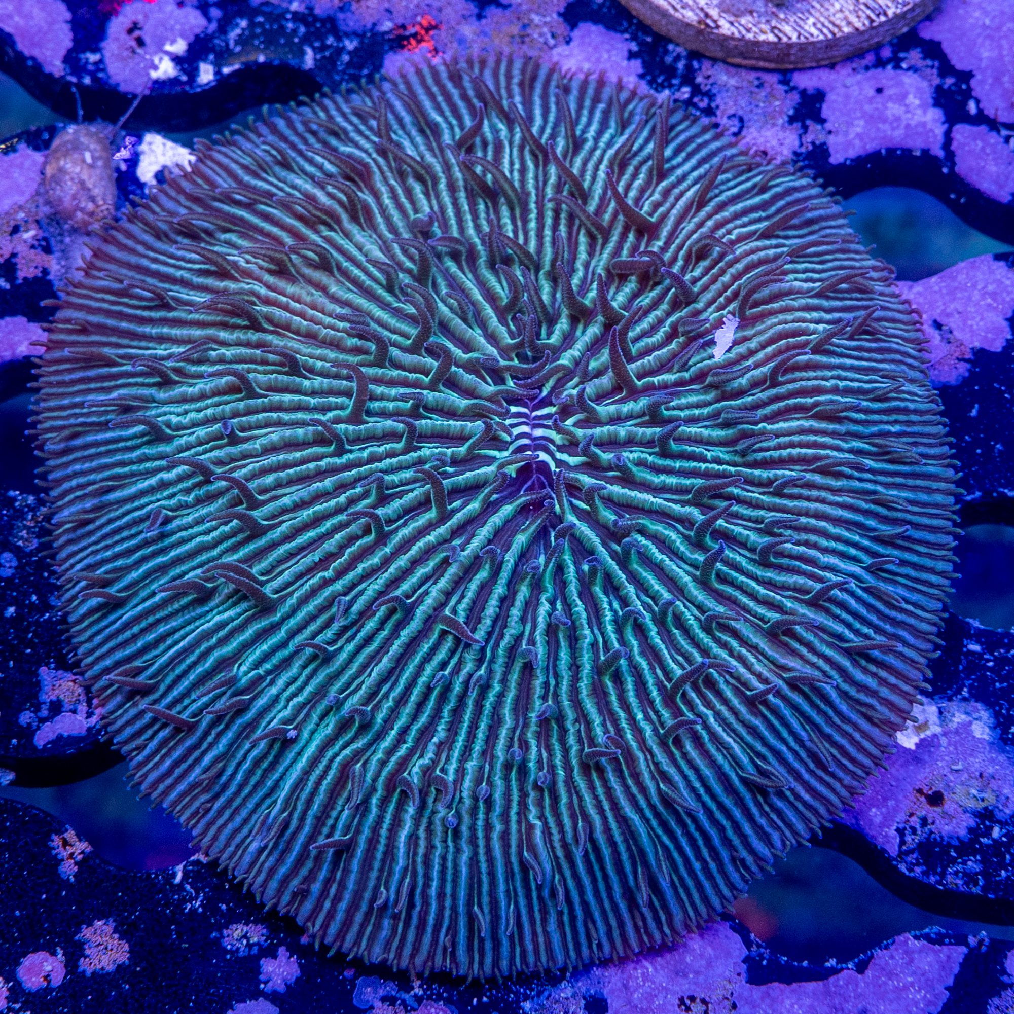 Plate Corals emcompass for more than just fungia, including Cyclopensis, Herpetolita, Heliofungia, Diaseris. We find the best color display to be in slightly lower lights, even partially shaded sometimes and they’re very easy to bleach. Ideally placement is similar to a mushroom coral, but with a bit more flow. They really enjoy the bottom of a bare bottom tank but many species can be easily irritated by stray sand particals on a sand bed. If your find you’re struggling with keeping them long term on your sand bed, and its not a matter of flesh wound from blowing sand, one thing to check is to make sure your sand bed is well siphoned and not trapping nutrients, we move ours bi weekly to siphon underneath them to prevent any build up from irritating them.