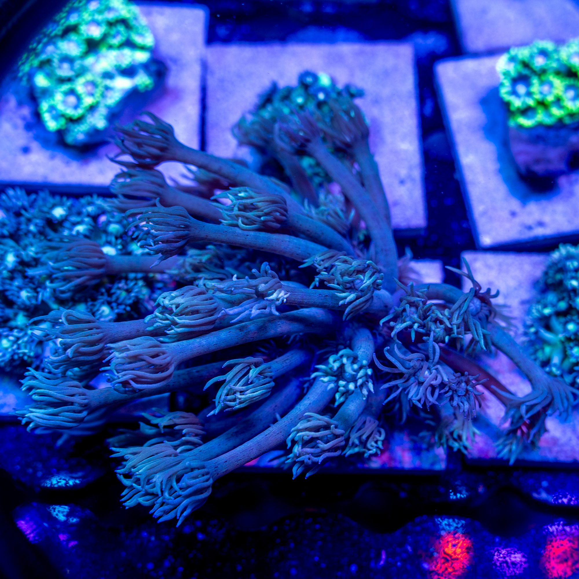 Gonipora is one our favorite here at DRC! Many reefers separate these into 2 categories: Long Tentacle and Short Tentacle, but there is a wide range species we import, and we’re constantly finding new varieties. We classify these as a moderate care level as they are particularly sensitive to phosphate levels above 0.10. They should also be given some room when placing, while many of them can be mounted flesh to flesh with each other, they can irritate alot of corals around them.