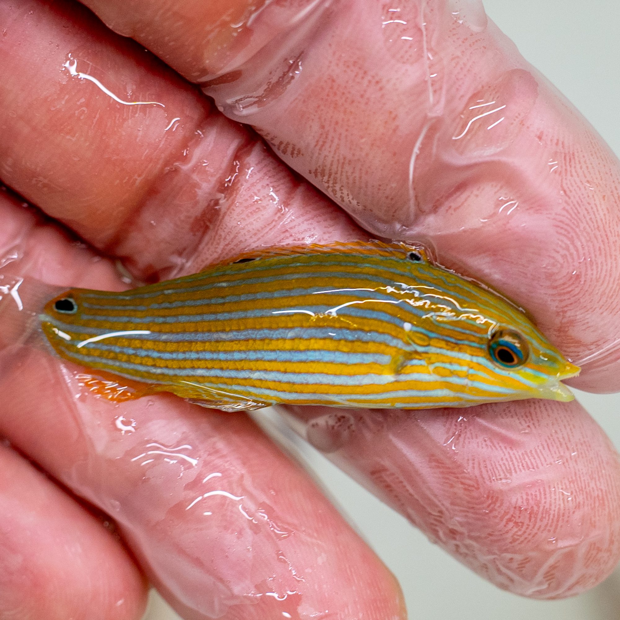 Beautifully striped yellow and blue juvenile, female Melanarus Wrasse.