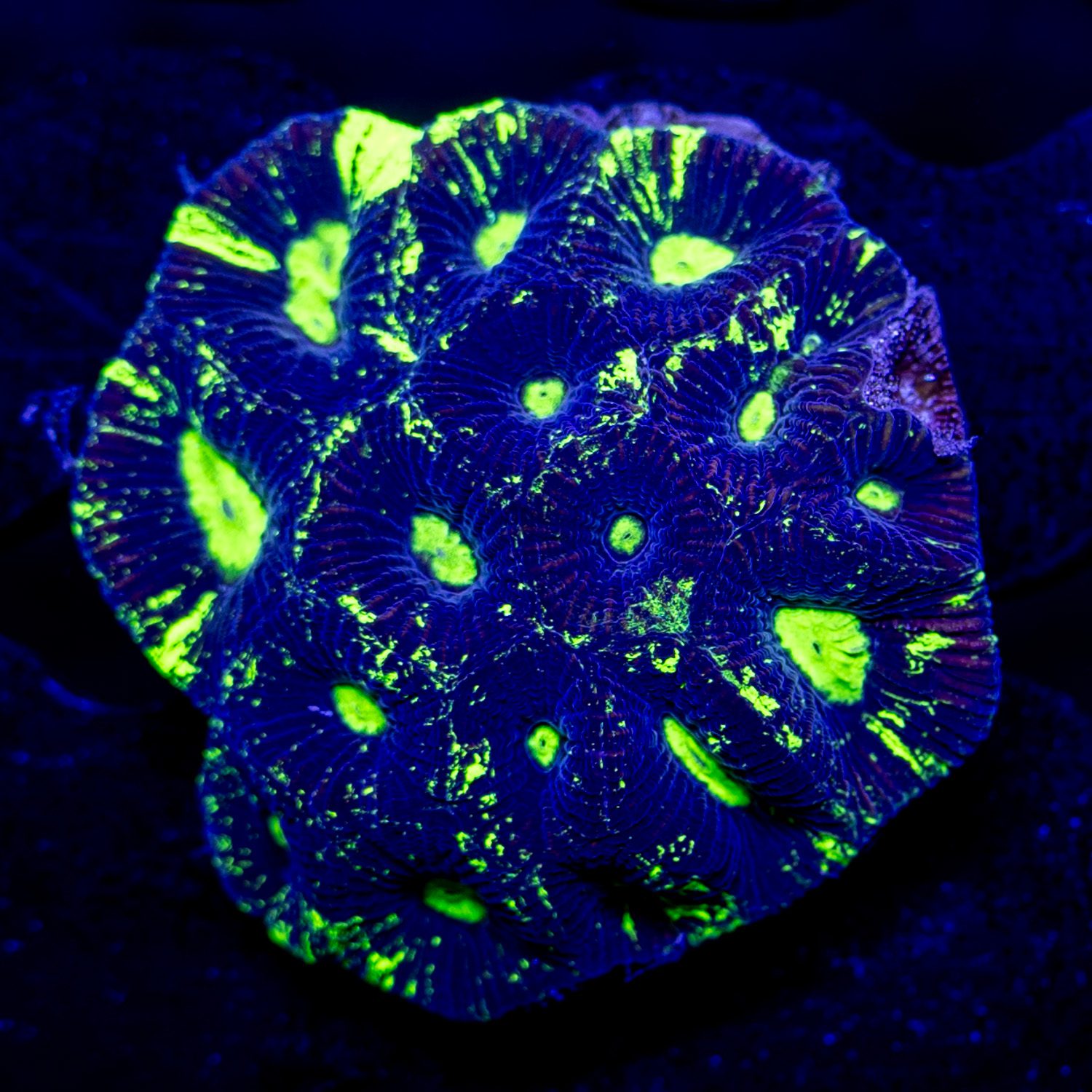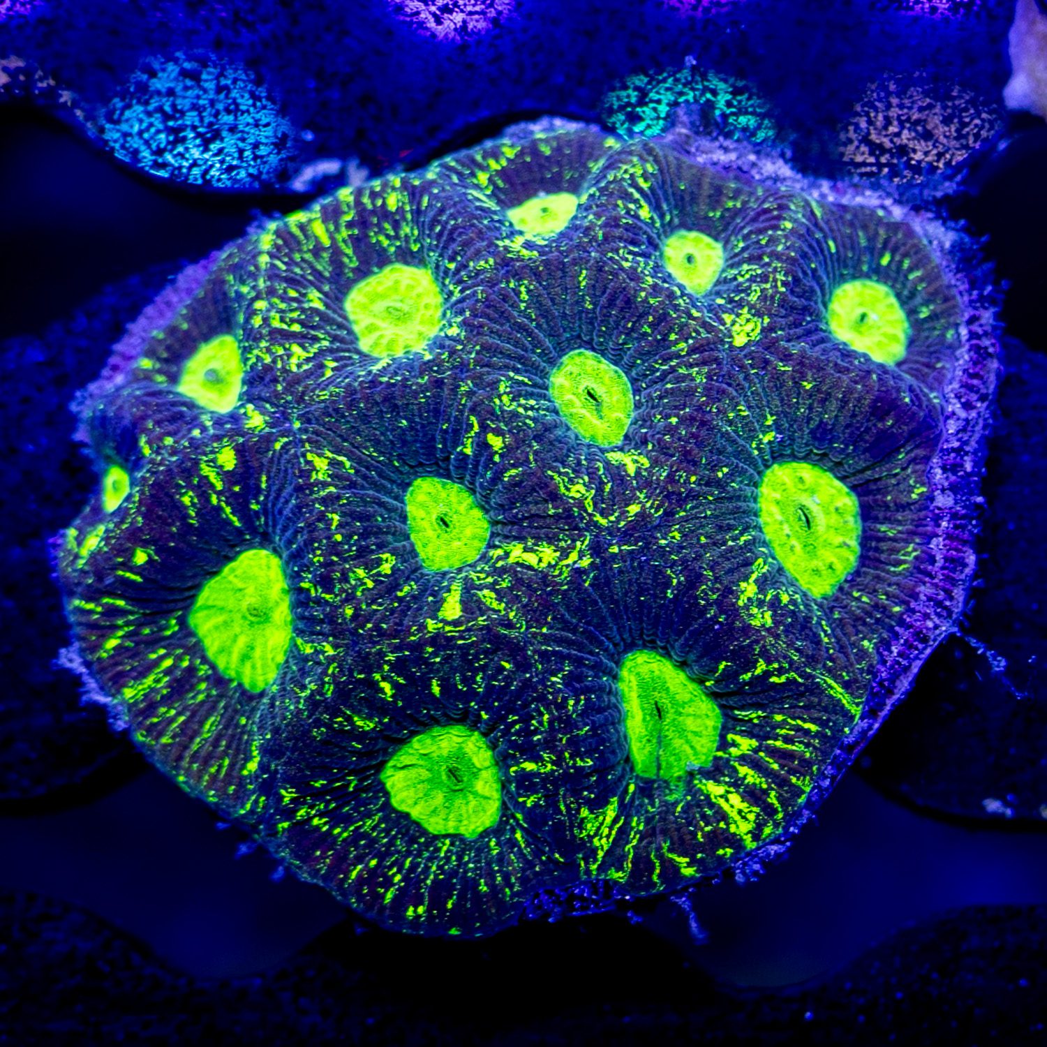 Goniastrea grows like a Favia, but tends to ball up more, forming a half circle versus spreading out more flat. Mindbender Moonstone is a long time favorite coming out of the Great Barrier Reef for its super bright green and high contrasting Dark Backdrop.