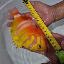 WYSIWYG Miniatus Grouper – he is a beautiful SOLID bright red with blue polka dots when not flaring his stress colorations, but haven’t gotten a chance to photograph him in tank yet.  He is a great eater, and beautiful fish!
