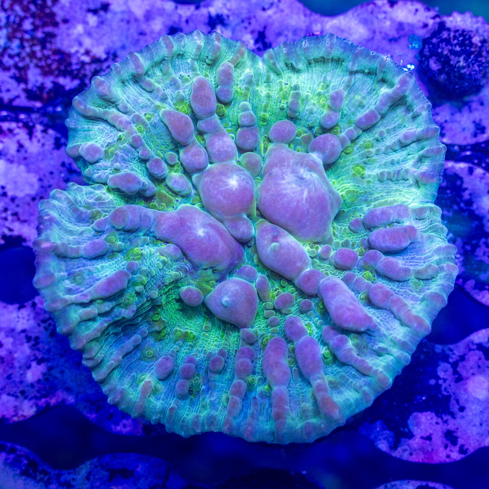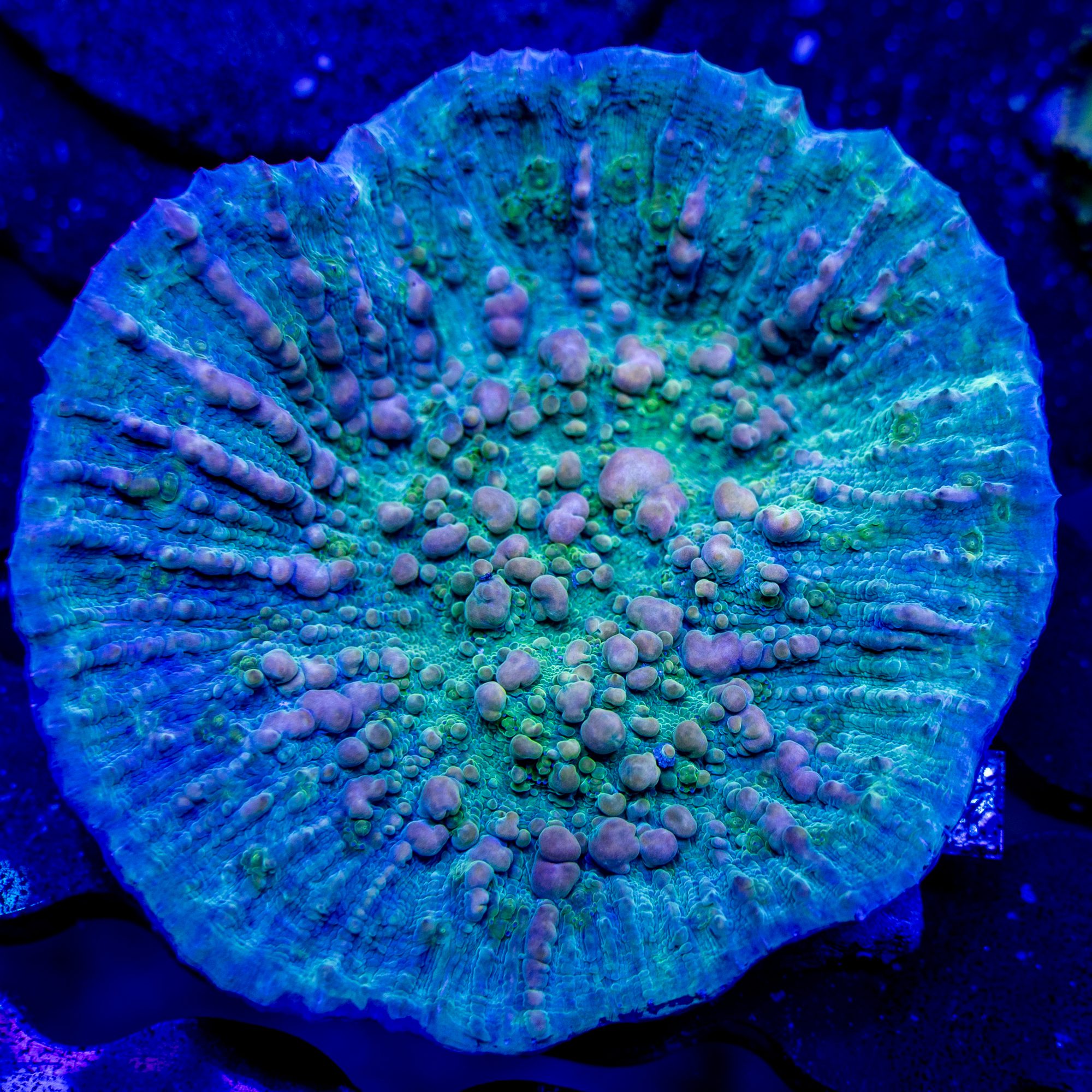 This Insane Chalice has been growing out at our facility for over 2 years!  This Bounce Chalice is absolutely insane, and one of the hottest corals on the market right now.  This will be our first release of it since fully developing the “bounce”.