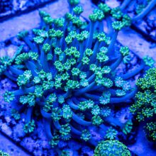 WYSIWYG Blue tentacle, green tip Alveopora that has been in our tanks for a year now, grown from a small frag!