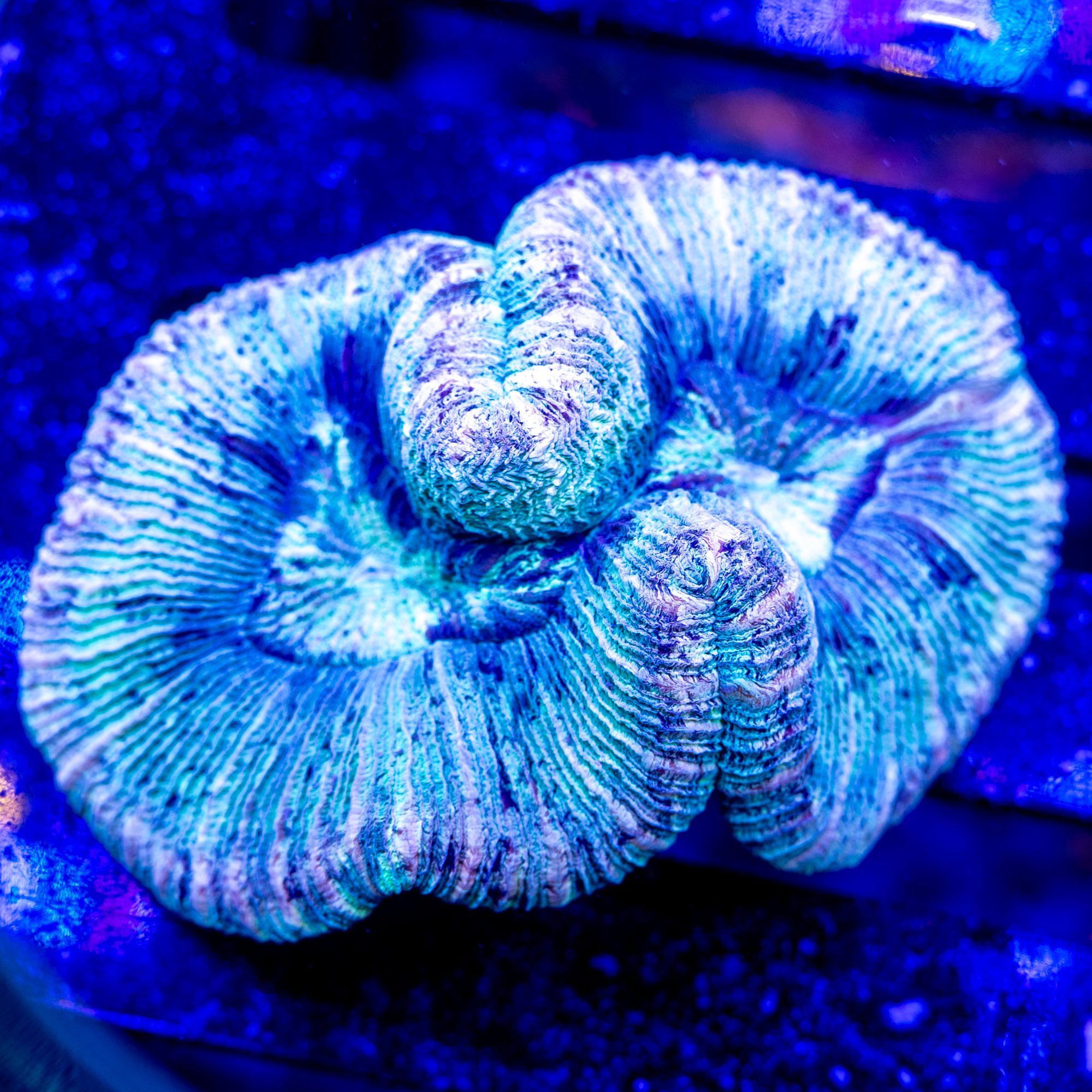 Trachyphyllia & Wellsophyllia are very similar in care. Maintaining stable alkalinity and pH are crucial to long term success. Trachyphyllia are one of the corals that we find most likely to develop new colors of zoaxelle bacteria flourishing in their flesh even months and months after acclimation to a new tank – it’s amazing to watch them progress, and we are currently working on a process tank for these corals in particular where we will move them from Quarantine to 60-90 days at a lower par, lower flow, in a high nutrient environment before we move them into our larger coral systems.