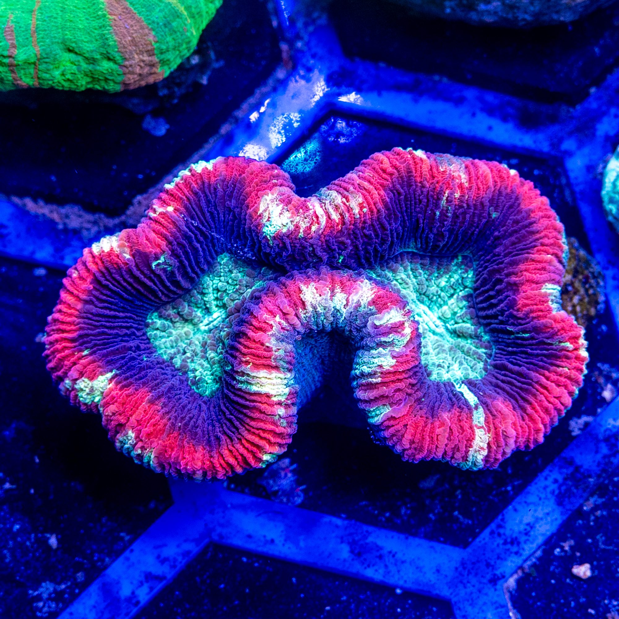 Trachyphyllia & Wellsophyllia are very similar in care. Maintaining stable alkalinity and pH are crucial to long term success. Trachyphyllia are one of the corals that we find most likely to develop new colors of zoaxelle bacteria flourishing in their flesh even months and months after acclimation to a new tank – it’s amazing to watch them progress, and we are currently working on a process tank for these corals in particular where we will move them from Quarantine to 60-90 days at a lower par, lower flow, in a high nutrient environment before we move them into our larger coral systems.