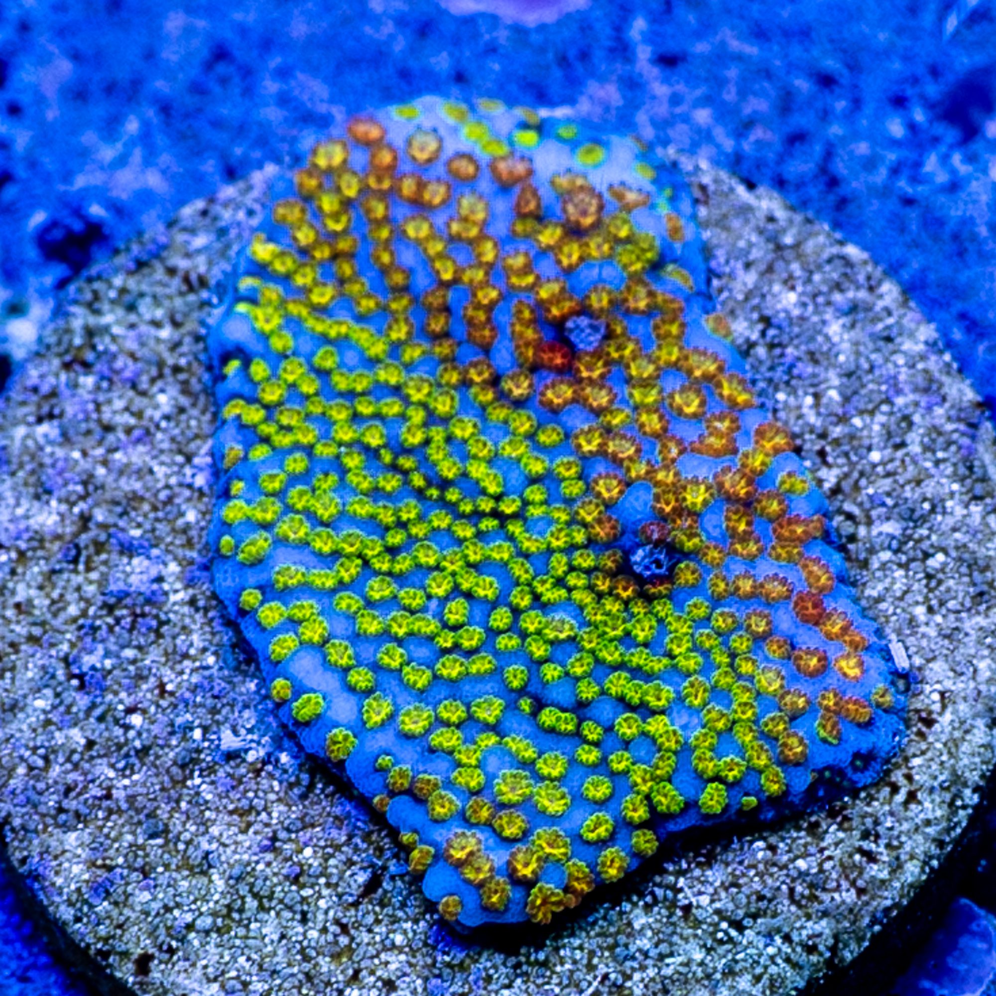 Beautiful Blue-Purple base encrusting Montipora, with green polyps fading to Yellow, Orange and Red for a beautiful Ombre look.