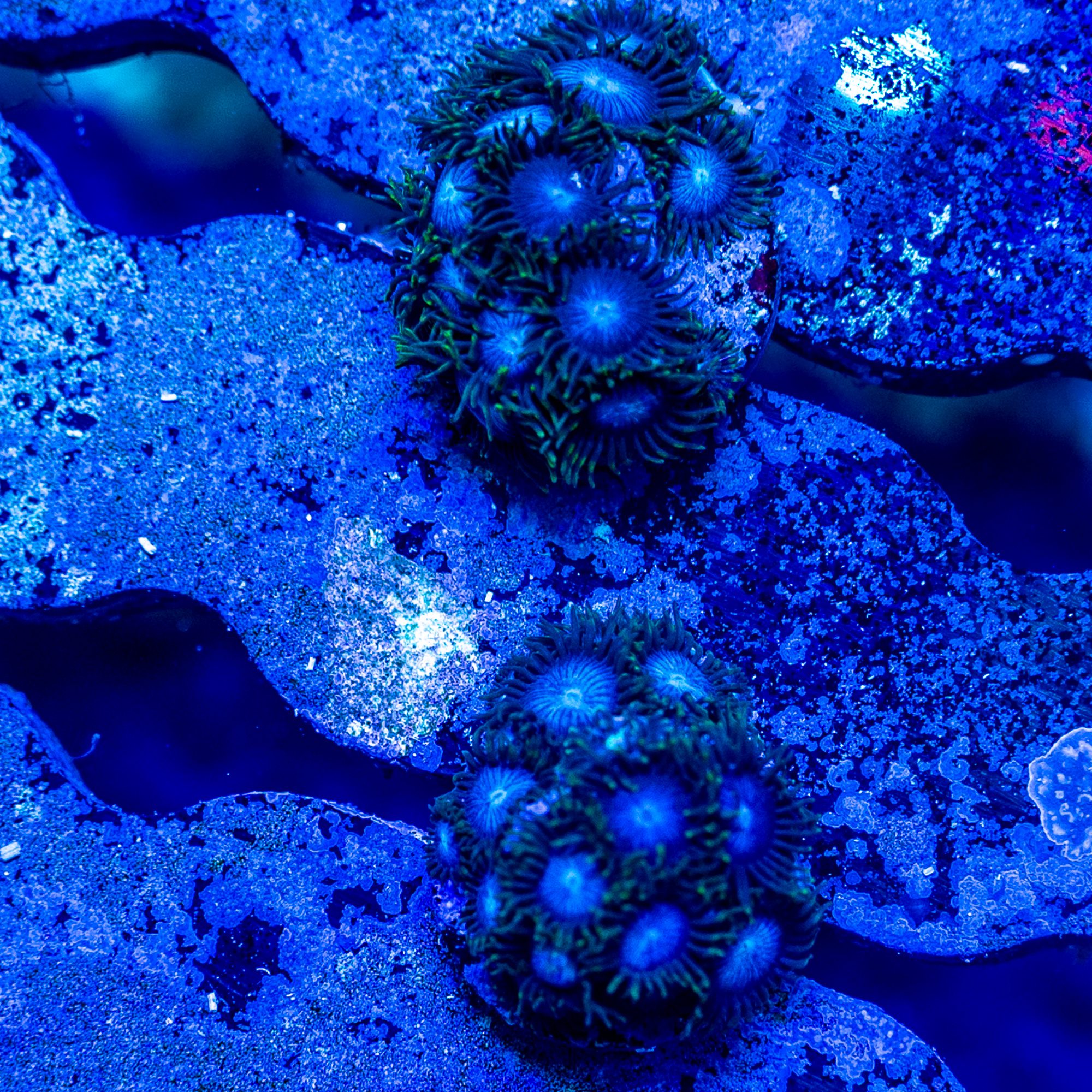 Bold Blue Zoas with forest green skirts, aquacultured at our facility.