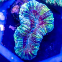 Trachyphyllia & Wellsophyllia are very similar in care. Maintaining stable alkalinity and pH are crucial to long term success. Trachyphyllia are one of the corals that we find most likely to develop new colors of zoaxelle bacteria flourishing in their flesh even months and months after acclimation to a new tank – it’s amazing to watch them progress, and we are currently working on a process tank for these corals in particular where we will move them from Quarantine to 60-90 days at a lower par, lower flow, in a high nutrient environment before we move them into our larger coral systems.