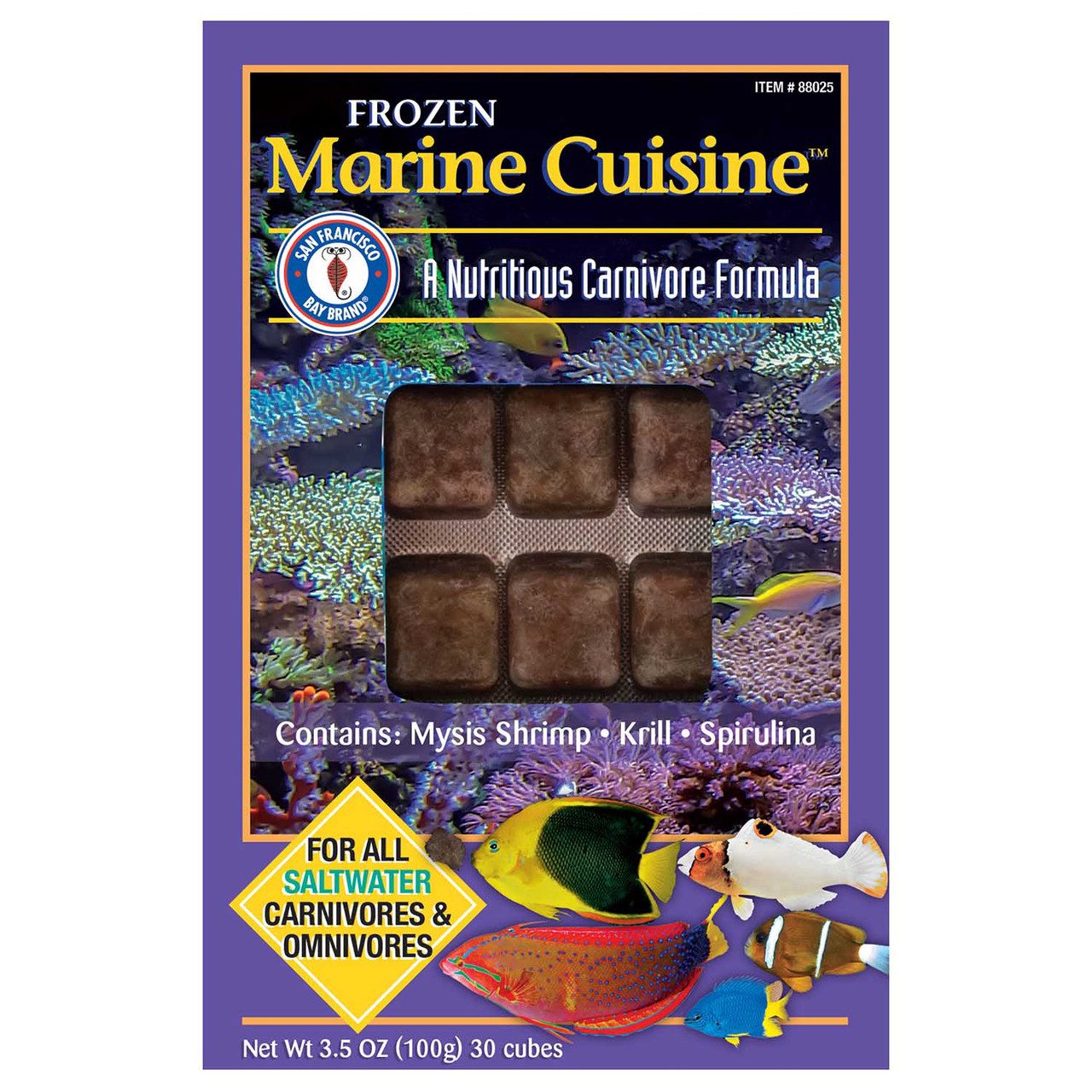 Marine Cuisine™ is a specially formulated diet for omnivorous and carnivorous marine fish. It is a blend of brine shrimp, natural seafood ingredients, color enhancers and vitamins. This combination of ingredients was developed to provide the same nutritional balance that is found on the coral reef. It has a natural texture and a familiar scent that rapidly stimulates fish and other creatures kept in saltwater or reef aquariums, to feed aggressively. This formula provides essential nutrients that help maintain high energy levels and vigor in your fish.