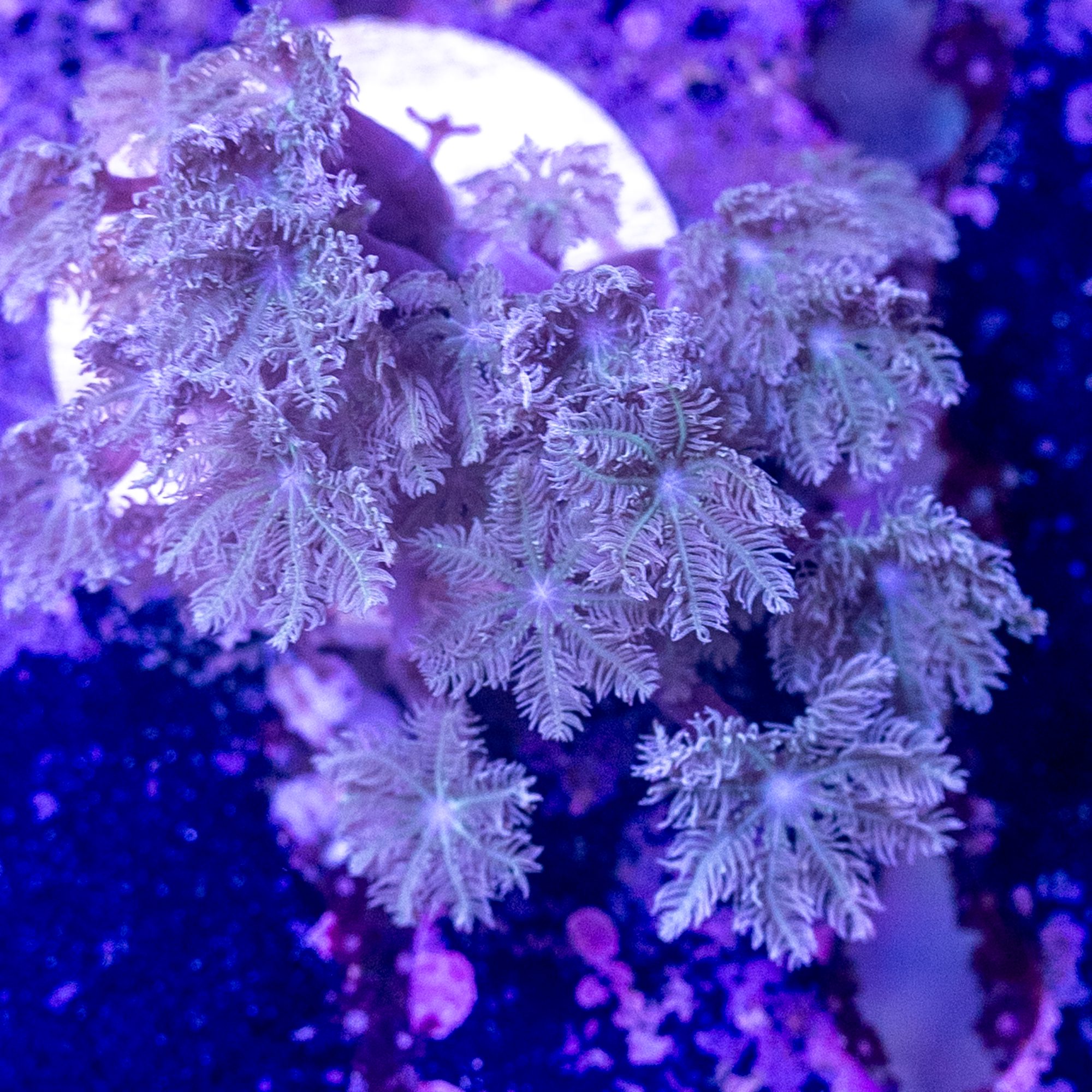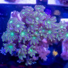 Clove Polyps or Clavularia sp. are a fairly easy to keep Soft coral. The trickiest part is placement, as you want enough indirect flow to keep the coral healthy, and prevent bacterial, fungal or algae from growing in between the polyps, but to high of flow and they’ll end up looking more like a Xenia blowing in the wind, in which case they often shrink up, and slowly loose polyps along the edges taking the brunt of the flow. We also find that they can do well from quite low, to Moderately high light with some time to adapt, but often maintain large Polyp Size when kept at a bit lower PAR.