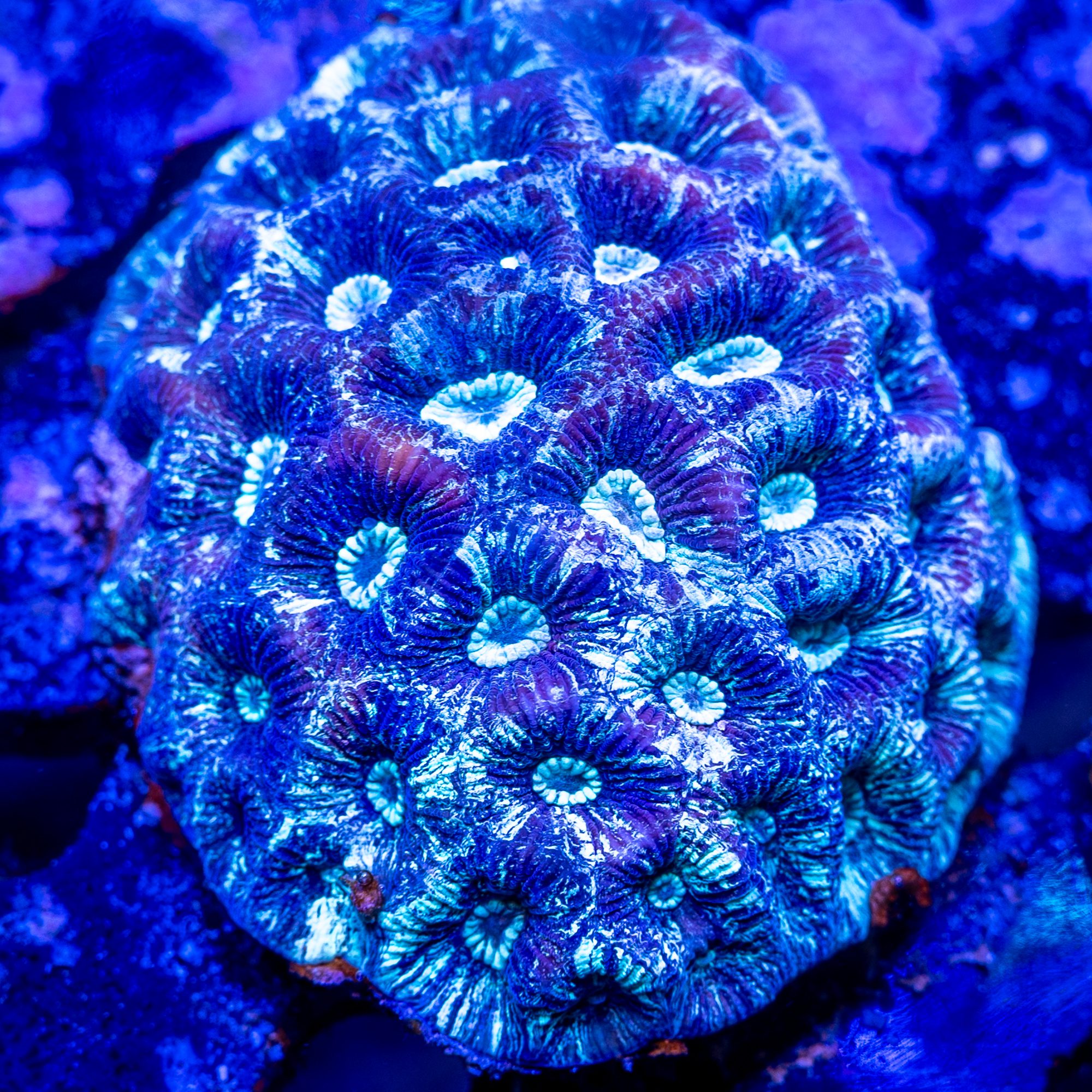 These will be the only 3 frags released of this beautiful and unique Moonstone until aquacultured frags are ready, probably about a year. Powder blue base with rich purple splatter make this so sweet its dangerous!