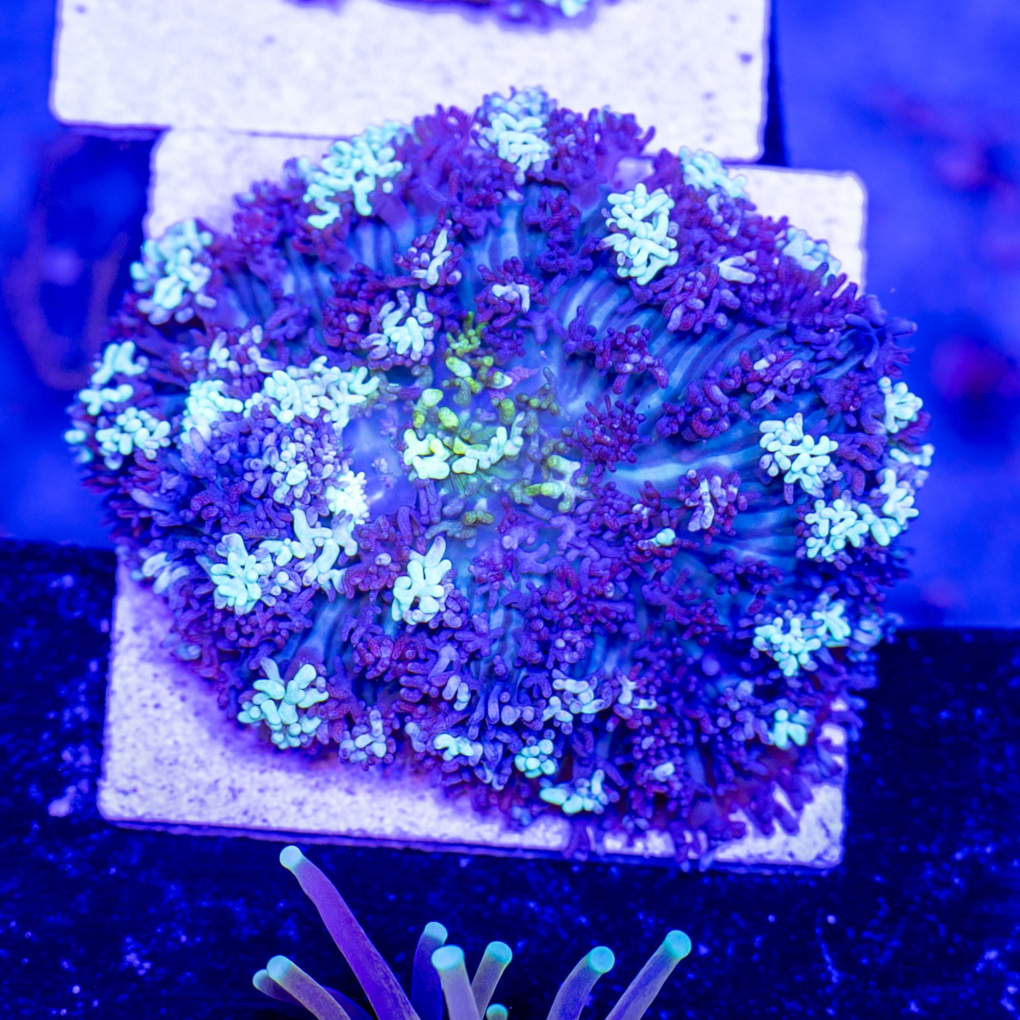 Rhodactis Mushrooms are beautiful intricately patterned mushroom corals that are a great option for beginners, but loved by seasoned hobbyists just the same. They thrive in low to moderate, indirect flow & are adaptable to a wide range of PARs with acclimation.