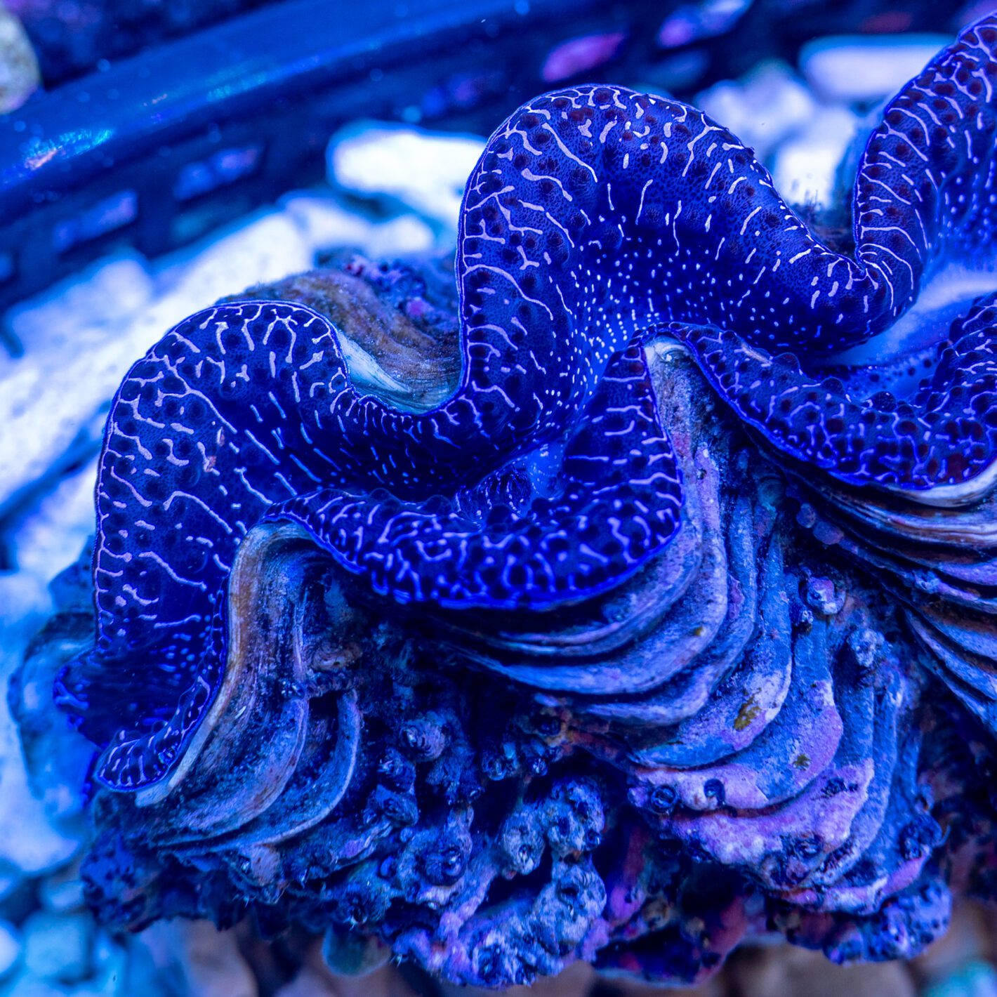 WYSIWYG Tahitian Maxima, Deep Navy Base with ornate electric blue striping.