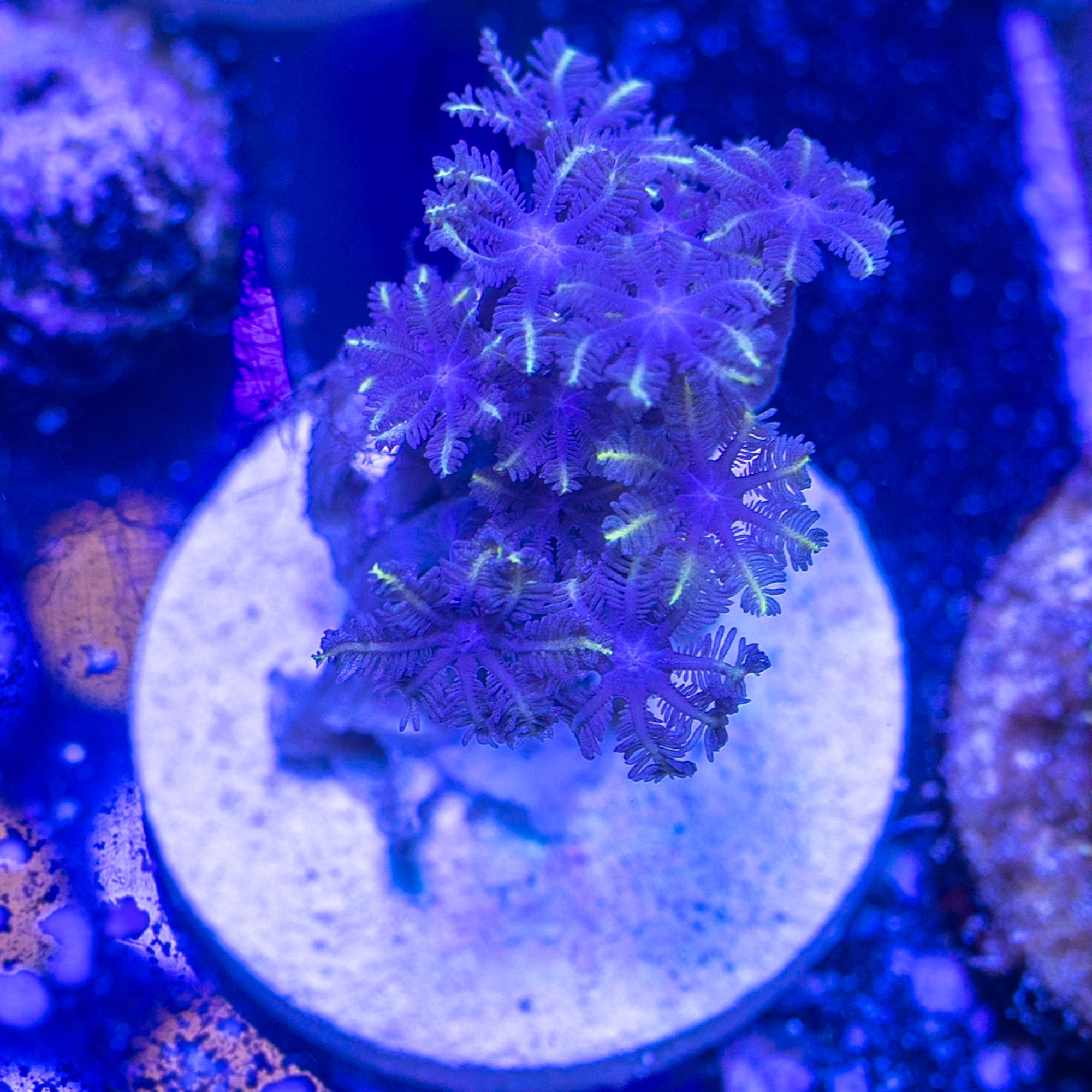 Clove Polyps or Clavularia sp. are a fairly easy to keep Soft coral. The trickiest part is placement, as you want enough indirect flow to keep the coral healthy, and prevent bacterial, fungal or algae from growing in between the polyps, but to high of flow and they’ll end up looking more like a Xenia blowing in the wind, in which case they often shrink up, and slowly loose polyps along the edges taking the brunt of the flow. We also find that they can do well from quite low, to Moderately high light with some time to adapt, but often maintain large Polyp Size when kept at a bit lower PAR.